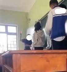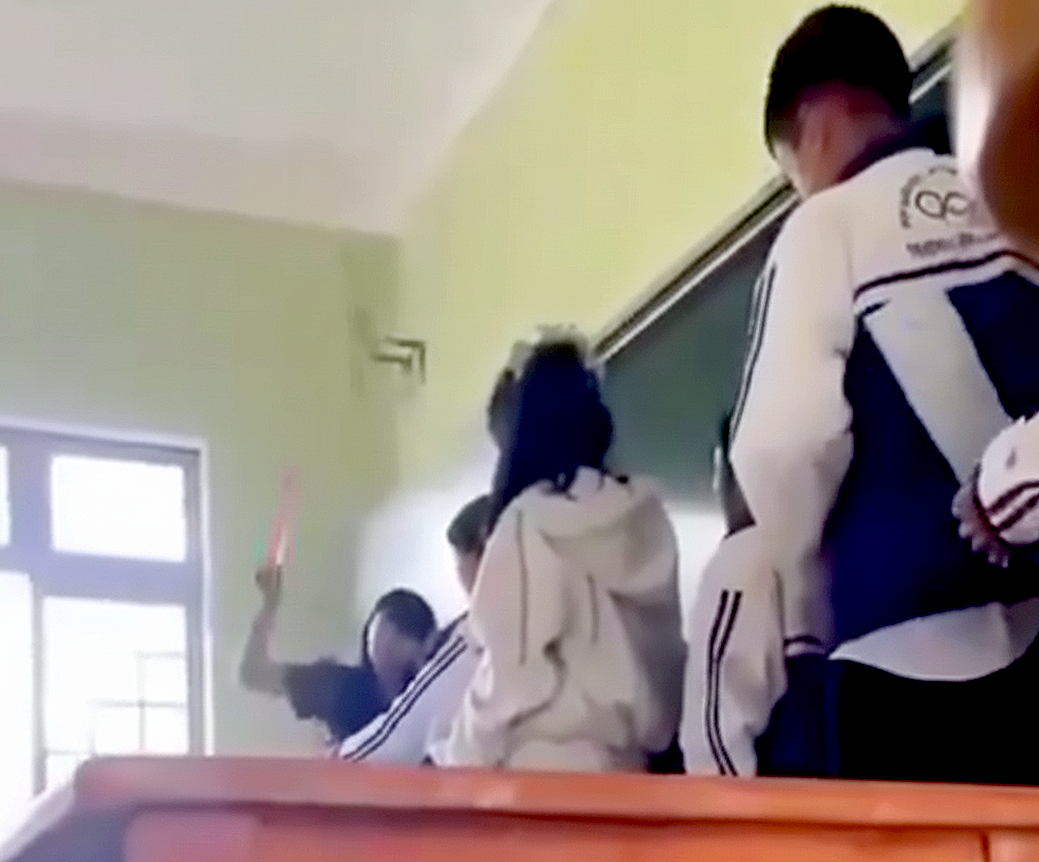 Hình ảnh ghi lại thời điểm cô giáo dạy hóa ở Trường THPT Anh hùng Núp – Gia Lai cho học sinh xếp hàng và dùng thước kẻ đánh vào tay các em – Ảnh: MXH