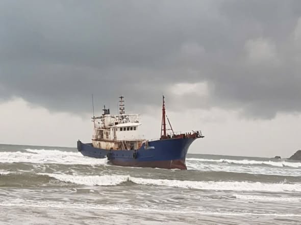 Tàu vỏ sắt mang chữ Trung Quốc, không người, trôi dạt rồi mắc cạn sát bờ biển Dung Quất. Lực lượng biên phòng đang triển khai phương án xử lý.